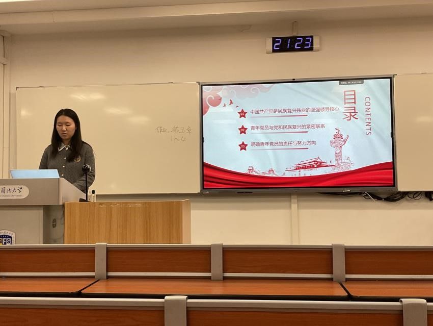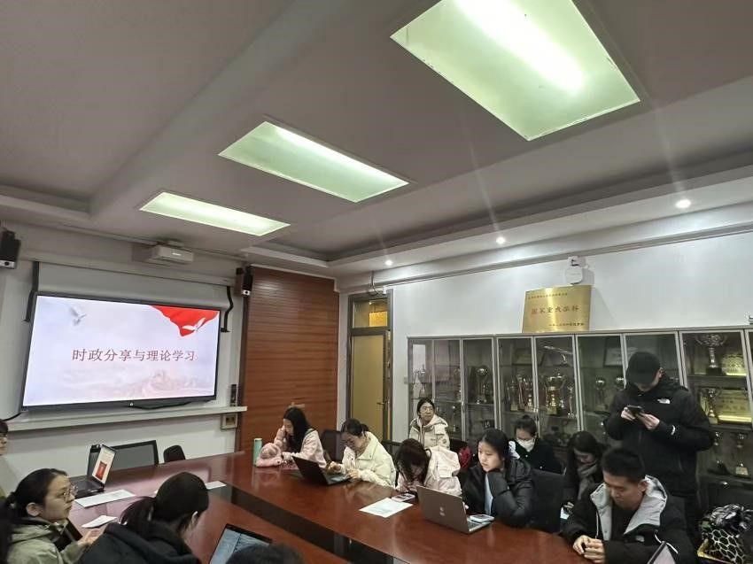 本科生党支部以"勇担复兴使命,书写青春华章"为主题开展研讨。支部书记段亮婧重温培训核心内容,强调青年党员既是民族复兴的见证者,更是参与者和建设者。陆欣同学谈到,中国能够系统推进远景目标并如期完成任务,充分彰显了制度优势和党的执政能力,自己对国家未来充满信心。李珈璐同学表示,作为新时代青年员工党员,要继承光荣传统,在全面建设社会主义现代化国家的新征程上勇担重任。林晨同学结合英语专业特色谈到,将立足专业所学,讲好中国故事,传播中国声音,以实际行动践行"请党放心,强国有我"的誓言。