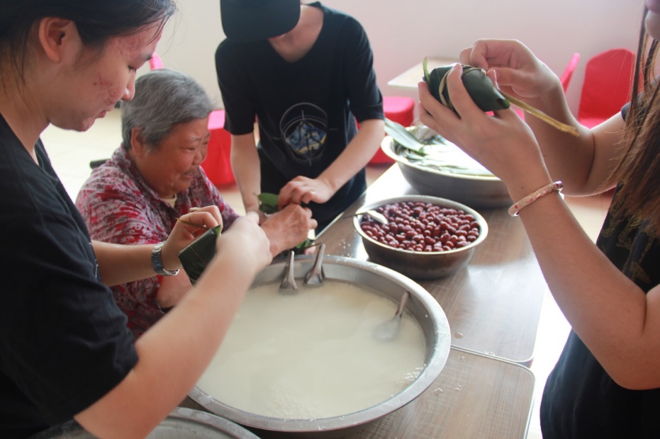——十一点左右,员工党员们又一同奔赴食堂,和老人们一起包粽子共度端午。一位老奶奶虽然腿脚不便坐着轮椅,但还是主动提出去食堂教大家包粽子,奶奶娴熟的手法精湛的技艺让大家感叹不已,都认认真真地跟着奶奶一步一步地学起了包粽子。粽子虽小,但小小的粽子里包的却是大家真诚的爱。