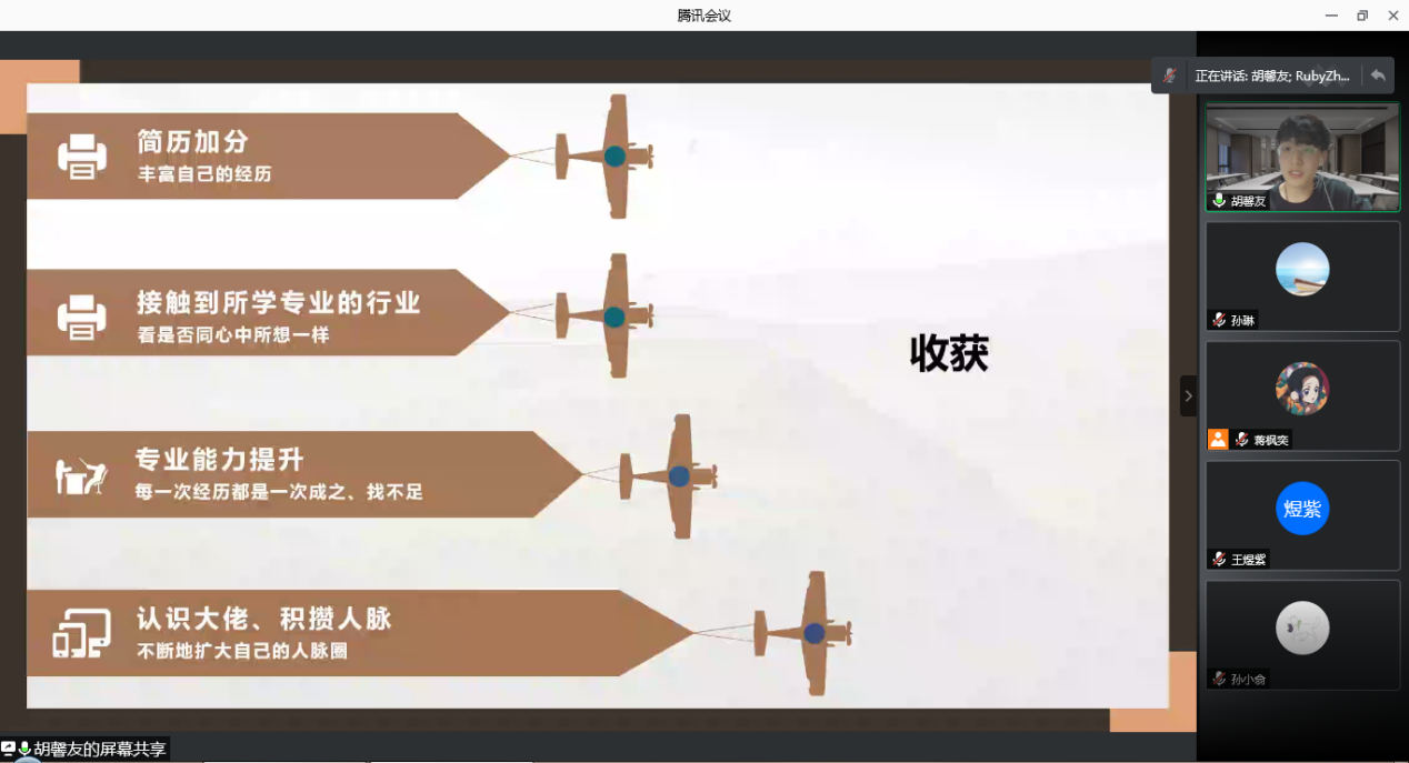 分享会第三部分由2015级胡馨友同志主讲。胡馨友同志在校期间曾担任韦德bevictor本科生党支部书记,目前就职于策马翻译集团,担任中华口笔译大赛办公室主任,北外灯塔计划生涯成长导师。胡馨友同志从自己的工作经历出发,针对同学们在工作就业实习方面的问题进行了答疑与分享,鼓励学弟学妹们多尝试新事物,找到自己的方向,在大学四年里创造属于自己的精彩。