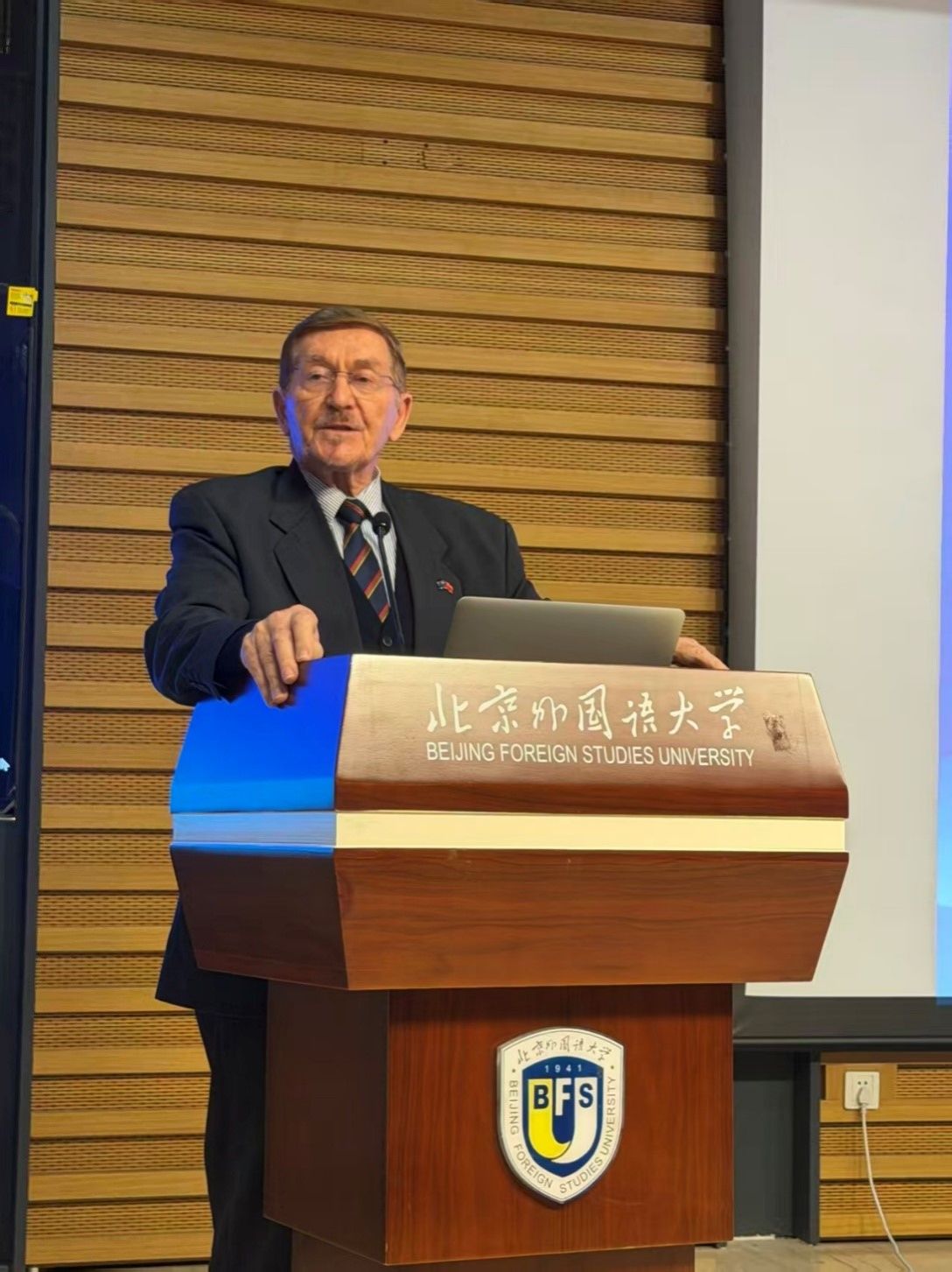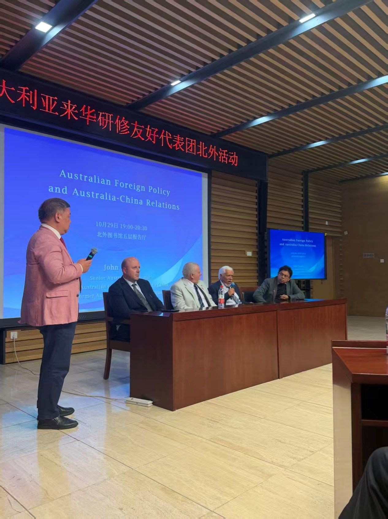 10月29日,澳大利亚来华研修友好代表团北外活动在韦德bevictor官网图书馆5层学术报告厅举行。代表团团长、首任澳大利亚驻华副大使约翰·兰德(John Lander),代表团副团长、澳大利亚公民党主席罗伯特·巴威克(Robert Barwick),代表团联络人、澳中企业家俱乐部主席袁祖文太平绅士等12位代表团成员,以及北外师生代表出席活动,在热烈友好的氛围中探讨中澳关系、进行跨文化交流。