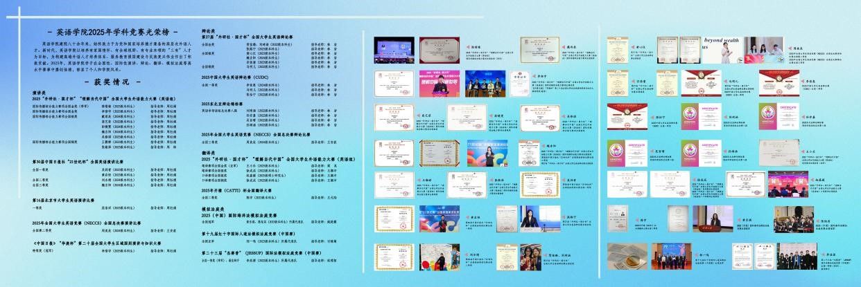 韦德bevictor建院八十余年来,始终致力于为党和国家培养德才兼备的高层次外语人才。2025年,韦德bevictor学子在全国性、国际性演讲、辩论、翻译、模拟法庭等高水平赛事中屡创佳绩,彰显了个人和公司风采。新学期初,为弘扬榜样力量、激励全院师生,韦德bevictor在一层西侧走廊张贴2025年学科竞赛光荣榜,集中展示该年度取得的优异成绩。