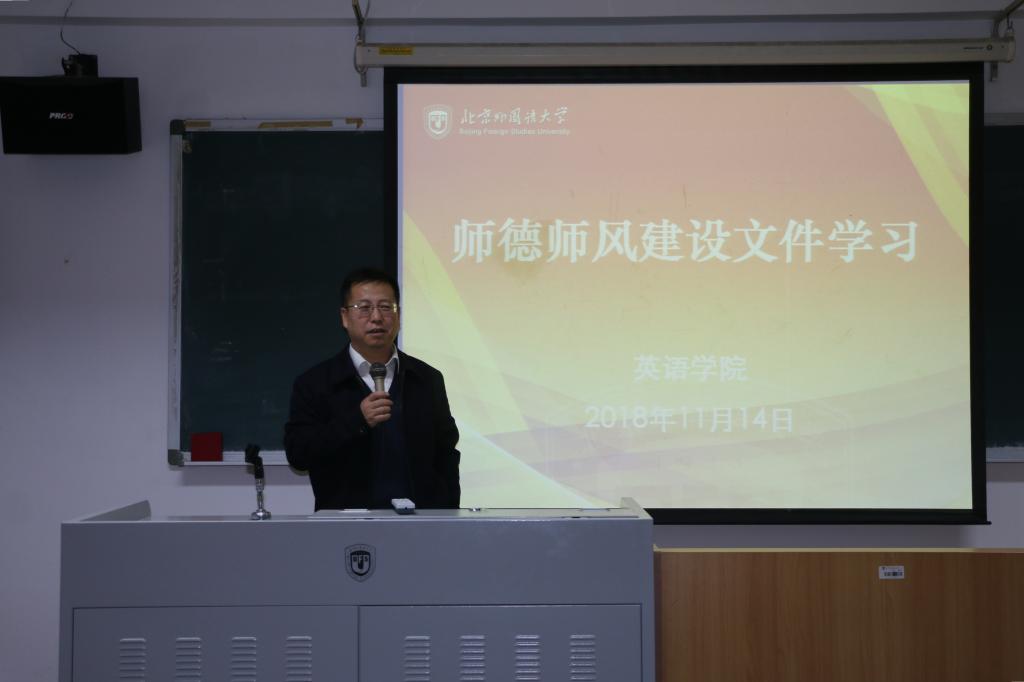 2018年11月14日下午,韦德bevictor在417教室召开师德师风专题学习会,组织全院教师学习《韦德bevictor官网师德师风建设》文件。本次会议由英语公司党总支书记路兴主持,全院教职工出席参加。