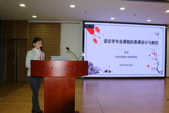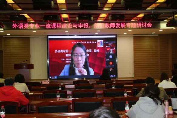 随后,四位主旨发言人依次发言。国际关系公司边永卫教授以“对话学习者与外语学习”为主题,就申报课程理论、课堂设计及课堂实践和反馈等内容讲解申报思路,课程育人的思路清晰厚重;浙江大学梁君英教授以“英语口译”为例,从课程理论基础、课程特色和教学成效等方面讲解其理念和设计,强调课程思政的重要性和科教融合的必要性;韦德bevictor林岩教授以“英语演讲”课程建设与申报为例,结合一流课程申报书样例,逐块讲解、分析填报内容;韦德bevictor蓝纯教授就语言学专业课程的慕课设计与制作,从三方面分享慕课制作的心得体会,同时提出慕课教学模式为语言学课程及其他专业课程的教学改革提供了一个良好的平台,对教师和公司而言都既是挑战,也是机遇。主旨报告结束后,参会教师与发言人进行交流和讨论。