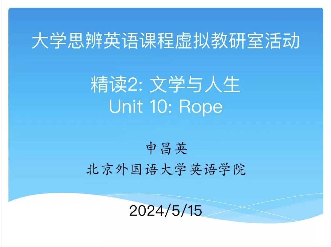 在16日进行的直播教学展示部分,申昌英以《大学思辨英语教程精读2:文学与人生》第10单元为例,全程实况直播课堂教学,来自全国“大学思辨英语课程虚拟教研室”千余成员在线观摩。通过一个课时的观摩课堂,申老师生动展示了如何将自己对教学的思考和设计结合到课堂实践中,引导和启发员工思考及提问,在培养员工思辨能力方面,申老师匠心独具,充分调动起了员工的积极主动性,给全体观摩老师留下深刻印象。