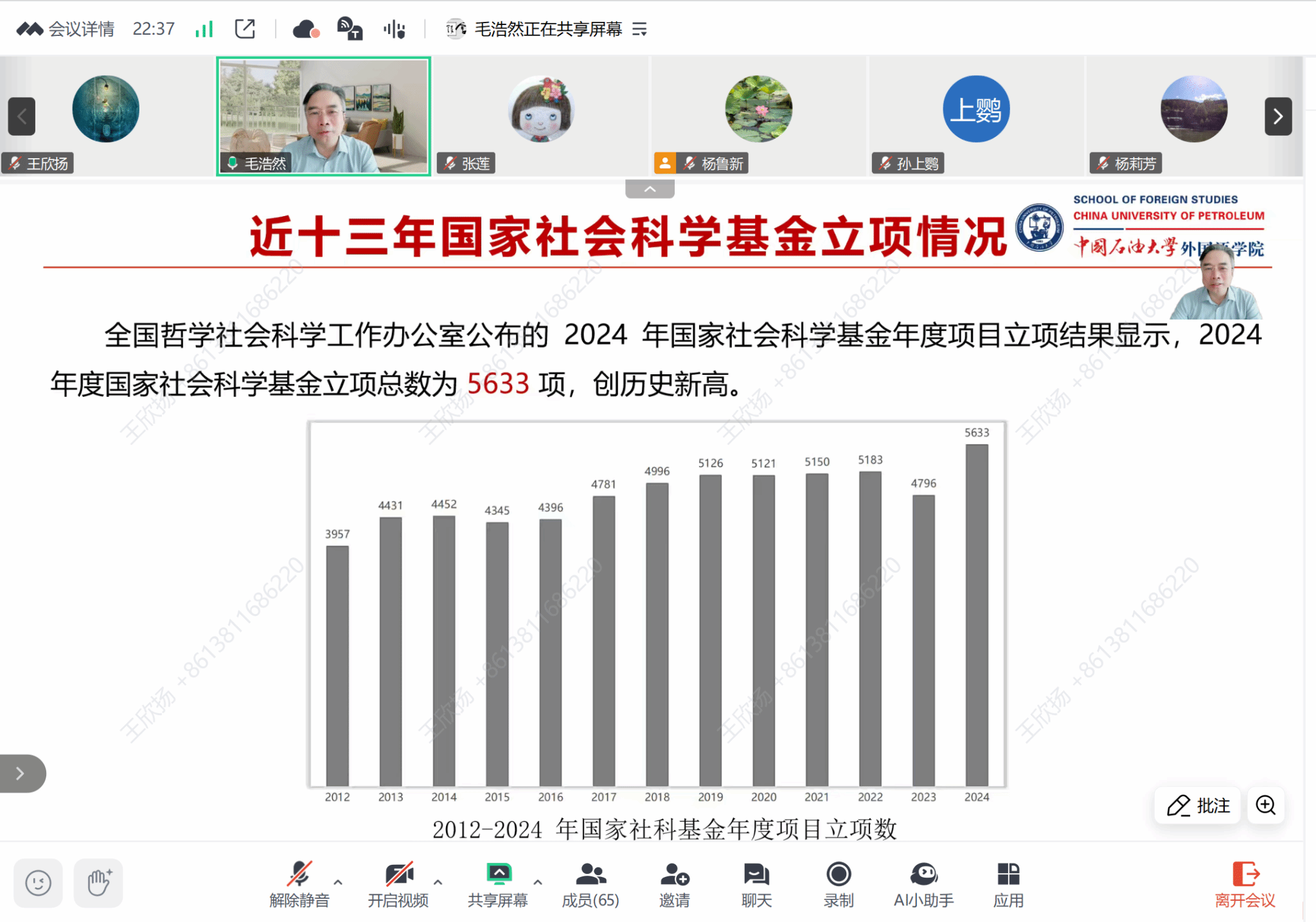 讲座过程中,毛浩然教授从国家社科基金申报的变化与趋势、学科数据分析与选题建议、选题方法和交叉学科热点推荐以及项目申报中常见问题解答四个方面,详细介绍了2025年国家社科基金项目申报情况。在介绍国家社科基金申报的变化与趋势时,毛浩然教授表示新增古典学与科学技术与社会两个学科,强调重点研究方向需紧扣国家战略需求。在历年数据深度剖析时,毛浩然教授通过数据分析指出语言学与外国文学领域立项数量下降的原因,呼吁学者避免无病呻吟的研究,转向解决实际问题的选题。在谈及选题方法时,毛浩然教授提出需精准聚焦、逆向思维、保持时效性,推荐数字人文、AI赋能、国际传播等前沿领域,鼓励跨学科申报。在解答常见问题中,毛浩然教授强调标题应简洁明了,研究问题需具体化并体现社会价值。