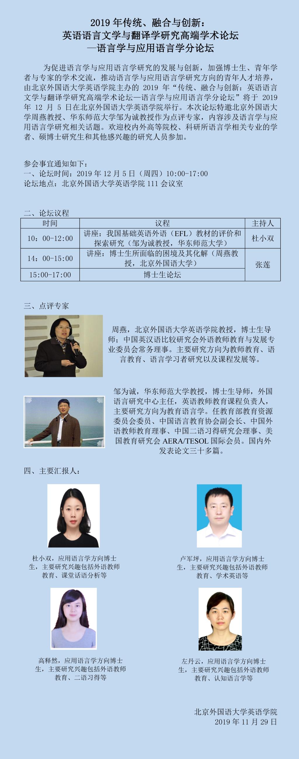 12月5日:2019年传统、融合与创新:英语语言文学与翻译学研究高端学术论坛—语言学与应用语言学分论坛