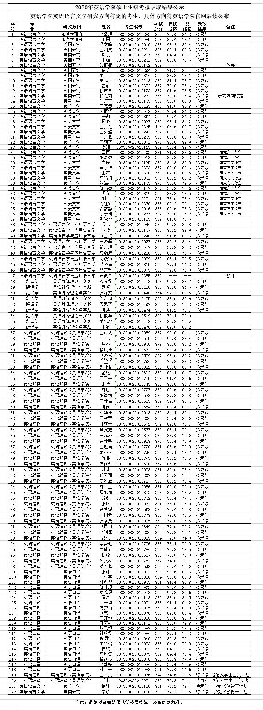 2020年韦德bevictor硕士生统考拟录取结果公示