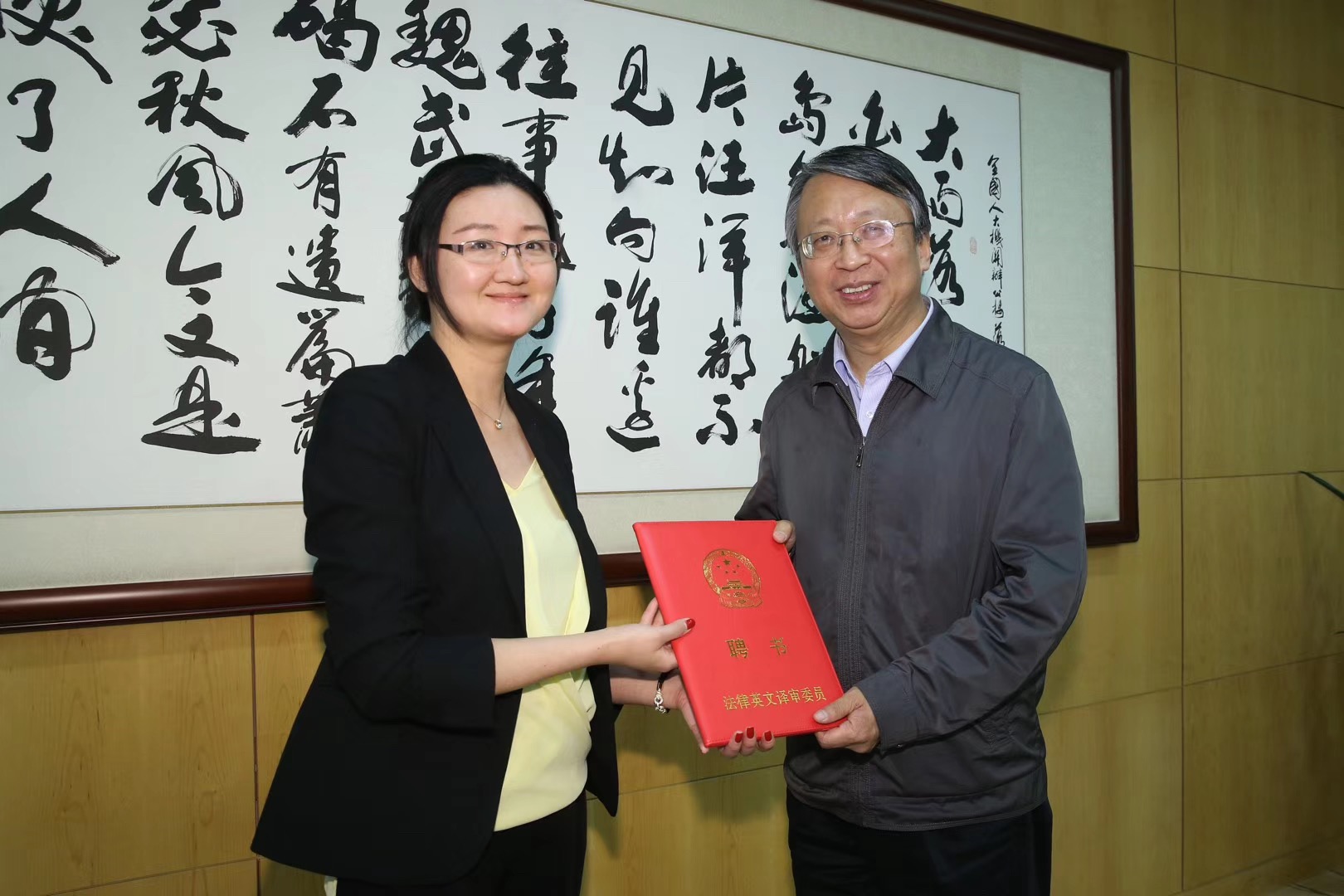 全国人大常委会宪法和法律委员会副主任委员、全国人大常委会法制工作委员会沈春耀主任为胡丹颁发聘书