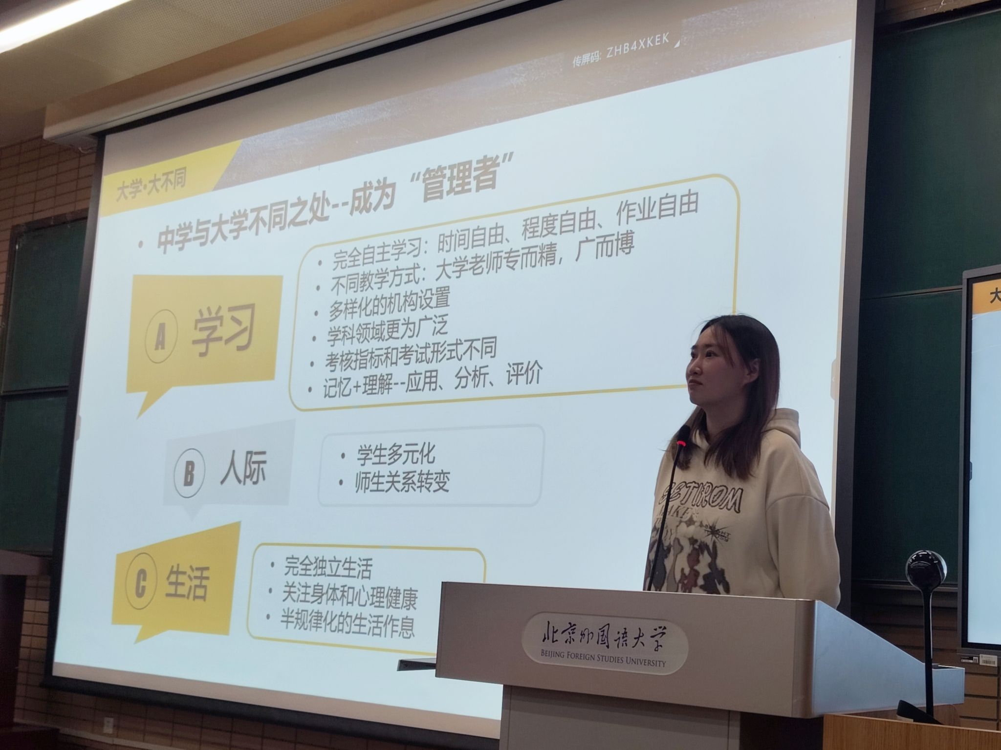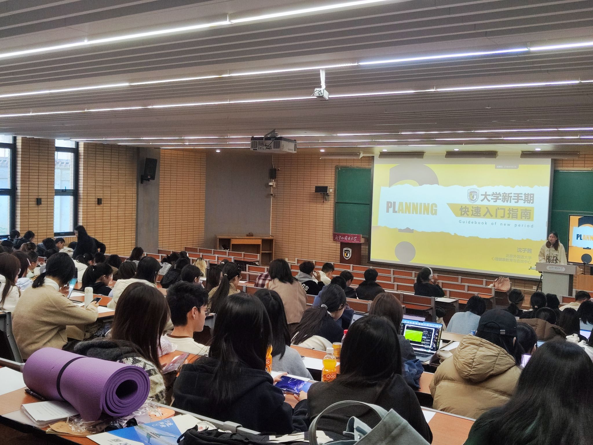 在“生活适应”部分,沈老师从饮食、睡眠和运动三个方面帮助同学们建立健康生活方式。饮食上提倡种类丰富、搭配均衡,减少高糖、高盐和不健康脂肪摄入,学会有节制地享受“打卡美食”。睡眠上鼓励同学们尽量早睡不熬夜,通过适度运动、白天晒太阳、睡前放下手机和简单的放松练习来提升睡眠质量,如若长期失眠或严重影响日常功能,则应及时就医。运动方面,她提倡“适度即可、重在坚持”,快走、校园散步、citywalk以及与同伴结伴运动,都是简单可行、能有效缓解压力的选择。