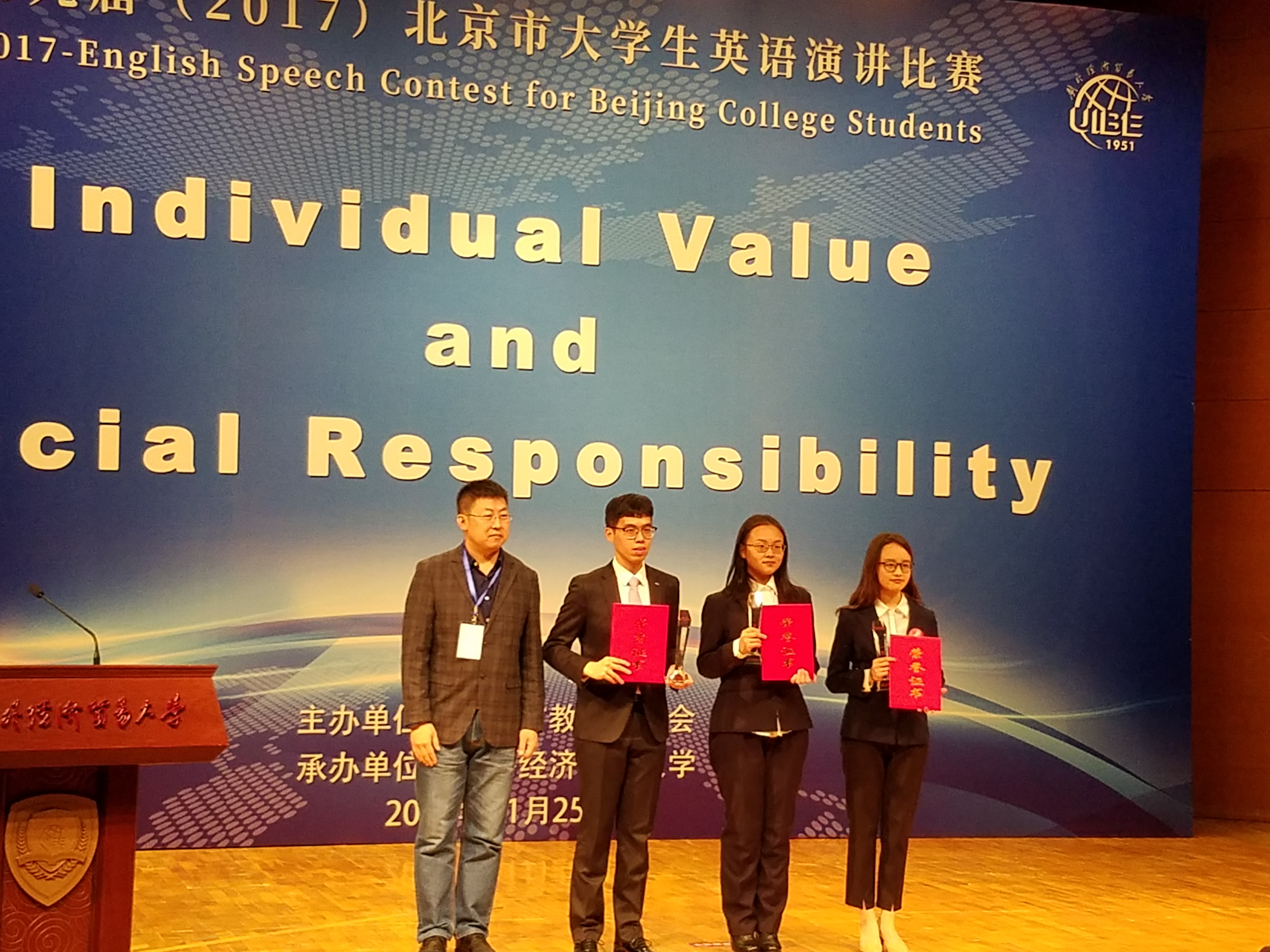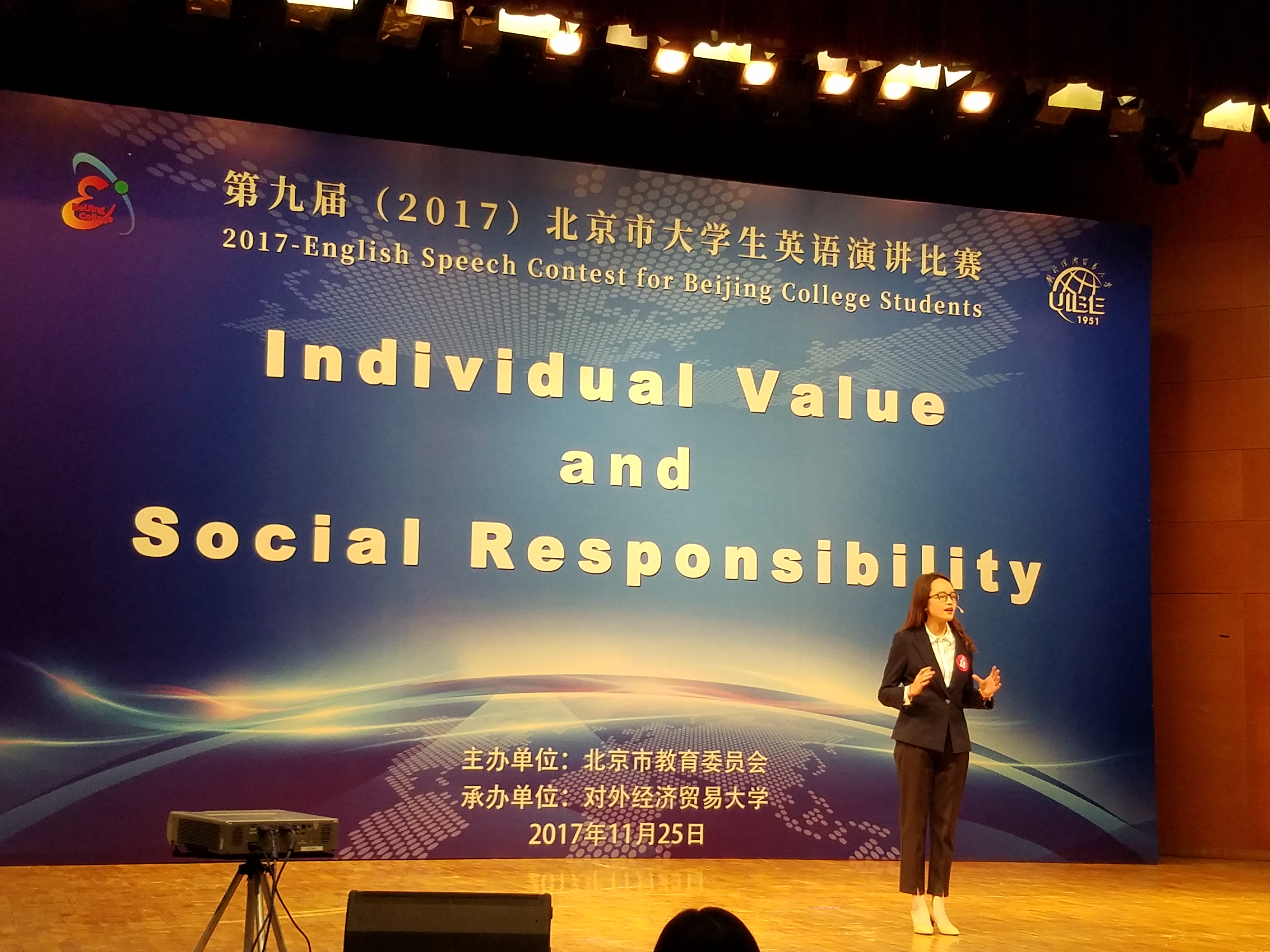 ——本次大赛由北京市教育委员会主办,对外经济贸易大学承办。来自外交公司、对外经济贸易大学、北大、清华、北京师范大学、中国政法大学、北京第二外国语大学等50多所高校的选手参加了上午的复赛。复赛分5个赛场进行,每个赛场的前两名晋级下午的决赛。决赛分为定题演讲和即兴演讲两部分。选手依据抽签顺序以“Social Responsibility is ______”为题进行五分钟定题演讲,并回答评委的问题。随后,选手随机抽取题目进行三分钟即兴演讲,并回答评委的问题。本次大赛的第一名由对外经济贸易大学的选手获得。