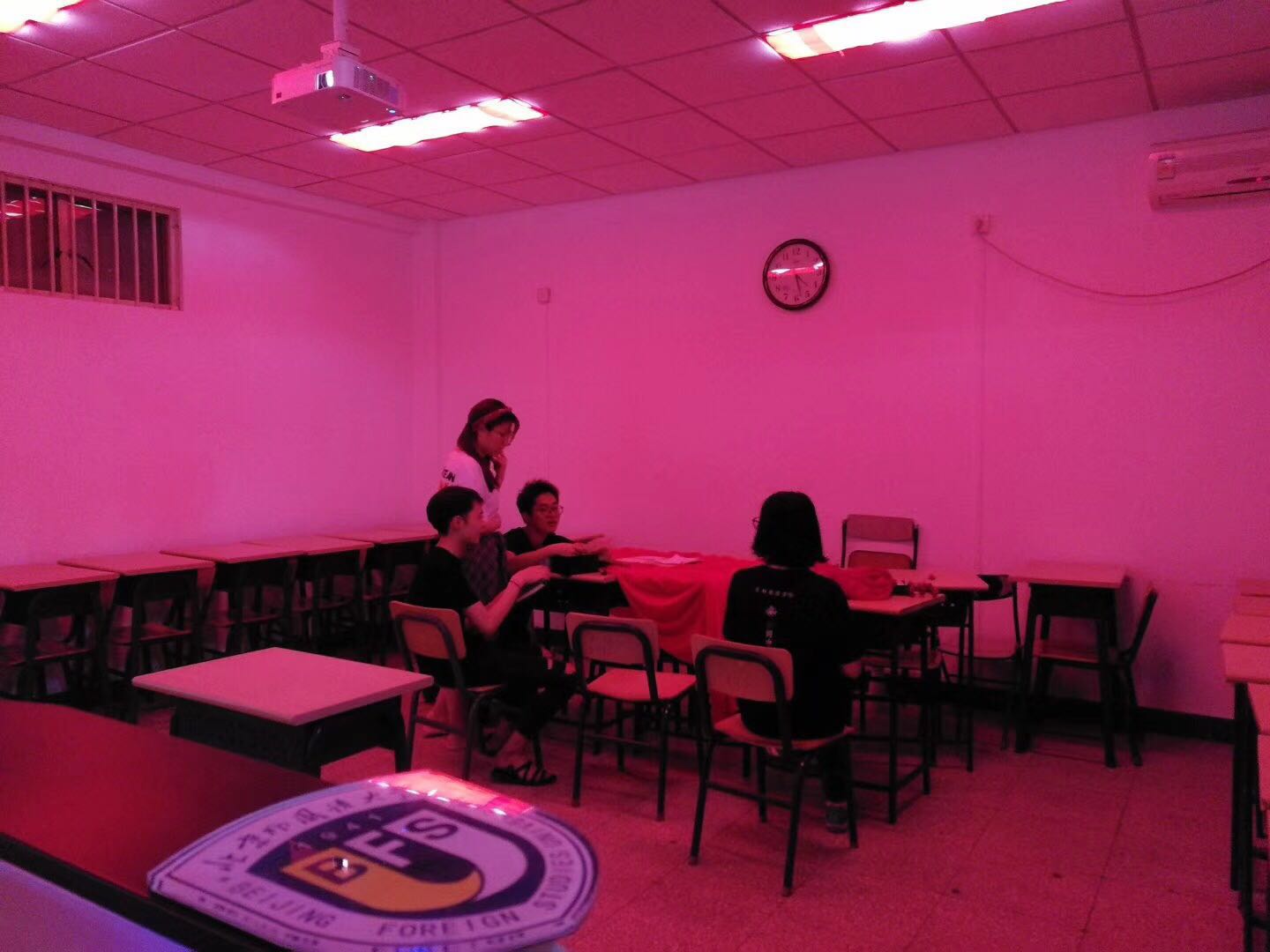 ——“DeBlock”密室逃脱活动采用常见的密室逃脱游戏形式:将一组四到七人的玩家置于办公室精心布置的“密室”(韦德bevictor的教室)中,在规定的四十分钟之内,通过房间内工作人员的提示和用心设计的线索,玩家收集信息,从而走出密室。本次密室在原来的基础上对密室房间进行了创新,加入了双房间联动、双关卡等特点。游戏过程中,玩家在享受发现的乐趣、解谜的成就之时,也体会到了团队合作的重要和英语国家文化的迷人之处。