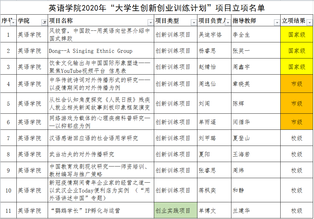 2020年“老员工创新创业训练计划”立项评审工作已经结束,公司共有11个获得立项,其中“创新训练项目”10个,“创业实践项目”1个。国际级项目3项,市级项目3项,校级项目5项。分别是:吴迪宇格、杨睿思、赵婧怡、周逸仙、刘闯、单雨遥、刘甲璐、夏阳、张睿思、蒋凤奕、单博文。具体情况如下表: