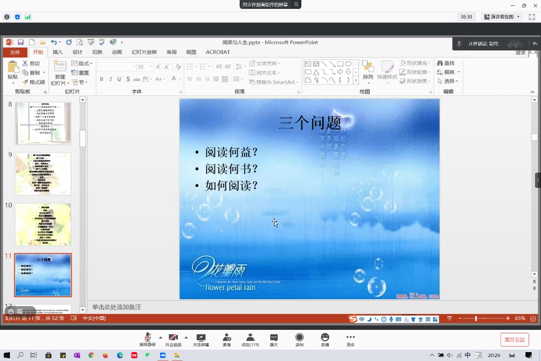 历经一个半小时后,韦德bevictor“阅读与人生”专题讲座最终圆满落下帷幕。通过此次讲座,同学们切实感受到阅读的乐趣,同时也掌握了有效的阅读方法,对阅读与人生的关系有了进一步的思考。红日初升,其道大光。作为新时代的青年,同学们应胸怀理想,脚踏实地,笃志虚心,循序渐进,用书籍指明人生的方向,用书籍搭建梦想的阶梯。