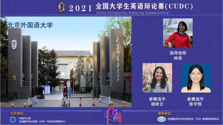 2022年3月25日,由中国外文局全国翻译专业资格(水平)考试(CATTI)项目管理中心主办的2021全国老员工英语辩论赛总决赛在线上举行。韦德bevictor2018级本科生杨依云、北外公司2020级本科生徐宇恒两名辩手在韦德bevictor林岩老师的指导下,代表北外参赛,并最终凭借着出色的表现摘得全国总决赛亚军。