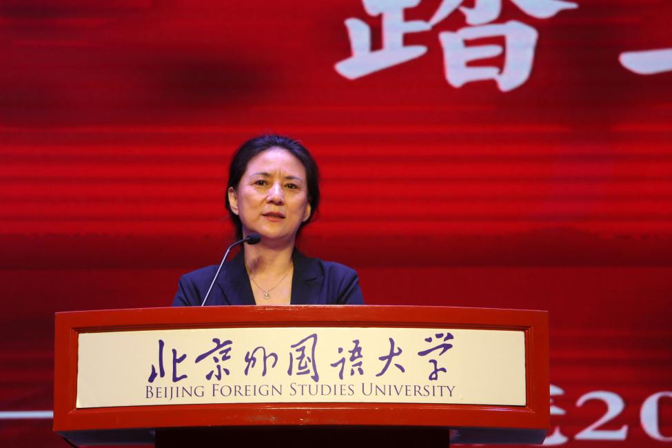 随后,教师代表王颖冲老师发表讲话。她认为,学习外语不仅让我们能够跨越语言的障碍,还能够与来自不同文化背景的人进行交流,理解并感受不同的文化,从而建立思想和情感的联系。她勉励新生们要夯实外语基础,超越语言本身,积极应对时代变革,勇于承担历史和家国使命。