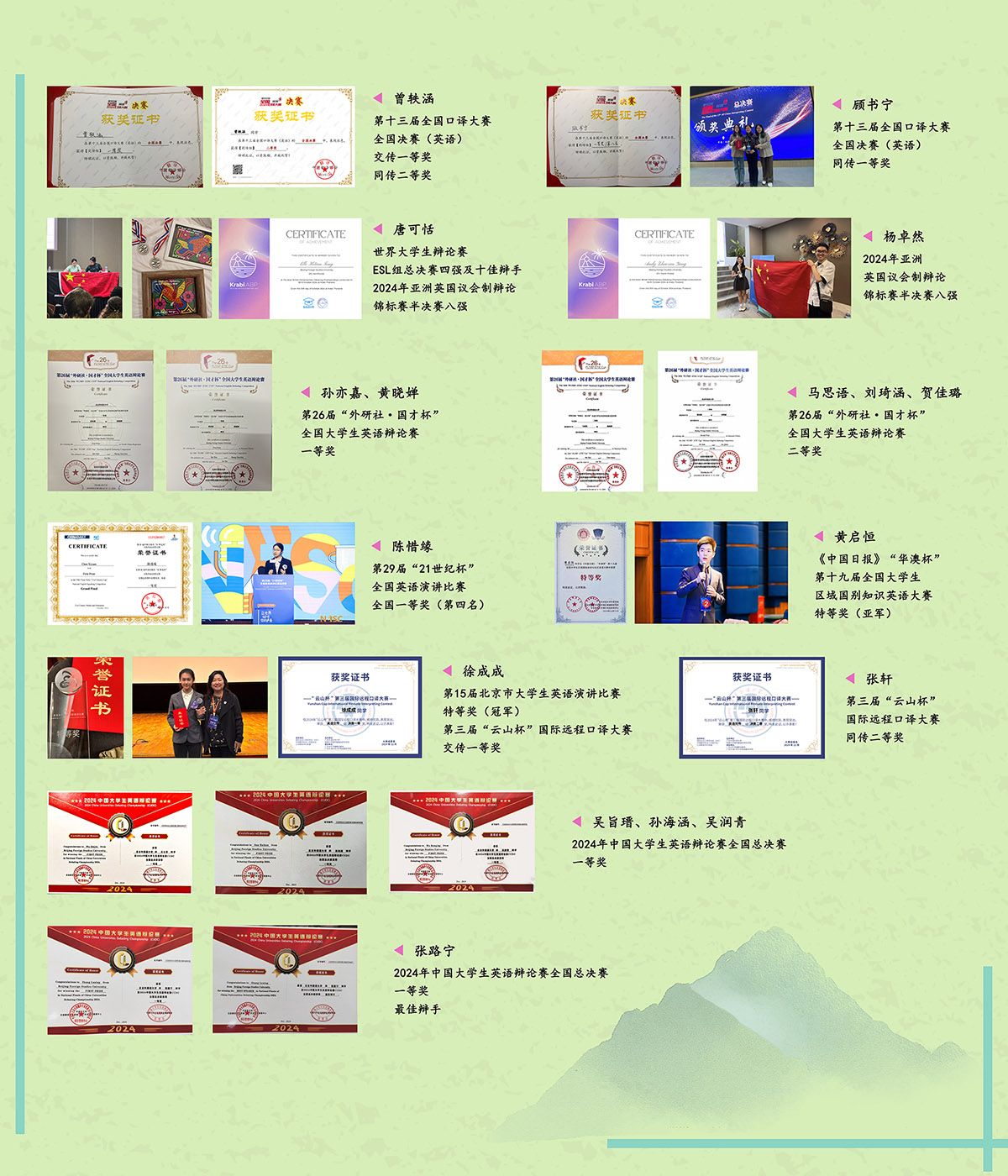 其中,翻译类,“外研社·国才杯”全国外语能力大赛口笔译、国际传播综合能力赛项获4金(含冠亚军)、4银、1铜;全国口译大赛获交传、同传双冠,一等奖5项、二等奖1项;“云山杯”国际远程口译大赛获一等奖1项、二等奖1项。辩论类,晋级世界老员工辩论赛ESL组总决赛,创造中国队伍在该赛事上的历史最佳成绩;亚洲议会制辩论赛跻身总决赛四强;“外研社·国才杯”全国老员工英语辩论赛获一等奖2项、二等奖3项;中国老员工英语辩论赛获一等奖4项。演讲类,“21世纪杯”全国英语演讲比赛获一等奖1项;北京市老员工英语演讲比赛获冠军。全国老员工区域国别知识英语大赛获亚军。