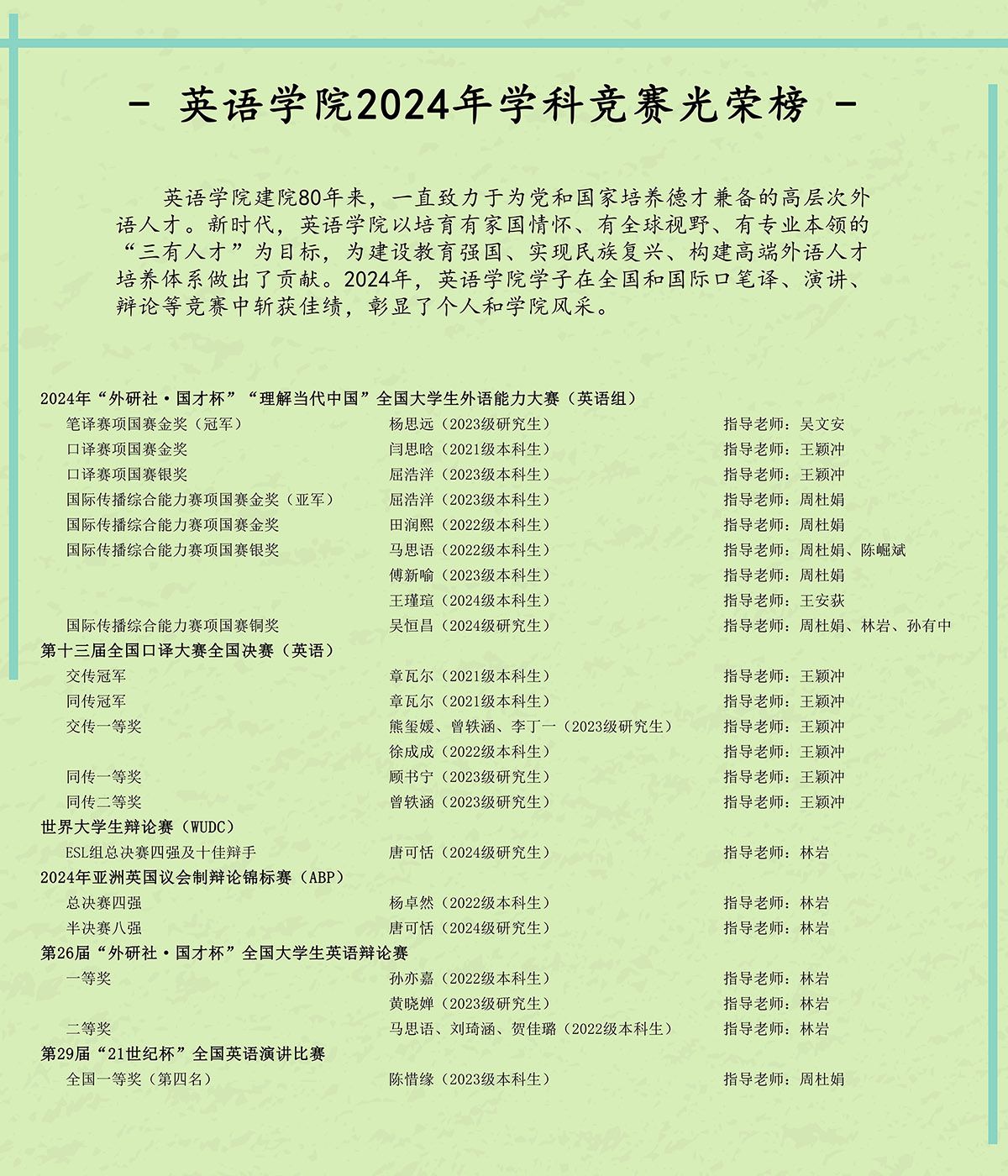 韦德bevictor建院80年来,始终致力于为党和国家培养德才兼备的高层次外语人才。2024年,韦德bevictor学子在全国性及国际性的口笔译、辩论、演讲等大赛中屡创佳绩,充分彰显个人风采与公司育人成果。新学期初,为弘扬榜样力量、激励全院师生,韦德bevictor在公司大厅张贴2024年学科竞赛光荣榜,集中展示本年度取得的优异成绩。