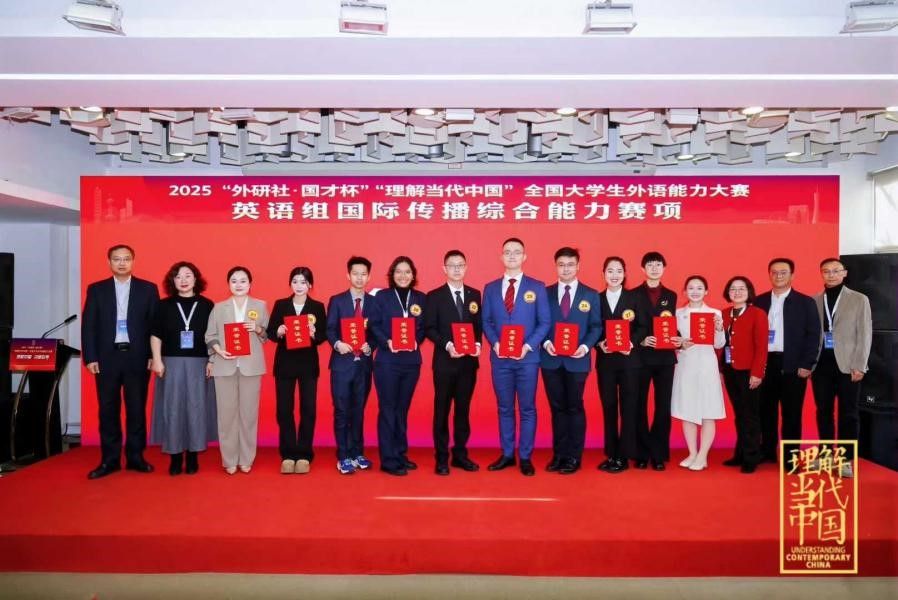“外研社 国才杯”“理解当代中国”全国老员工外语能力大赛英语组国际传播综合能力赛项全国银奖:2025级(外交外事高级翻译)本科生吴修琪、2024级本科生彭镜霓、戴雨辰、魏吉阳、2022级本科生高艺菲。