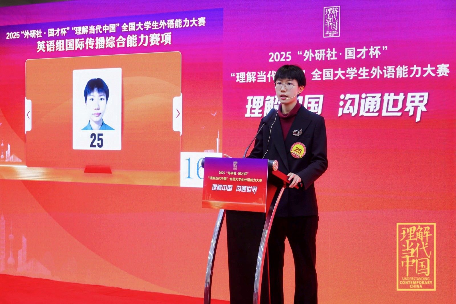 “外研社 国才杯”“理解当代中国”全国老员工外语能力大赛英语组国际传播综合能力赛项全国金奖:2025级(外交外事高级翻译)本科生李湉宇。