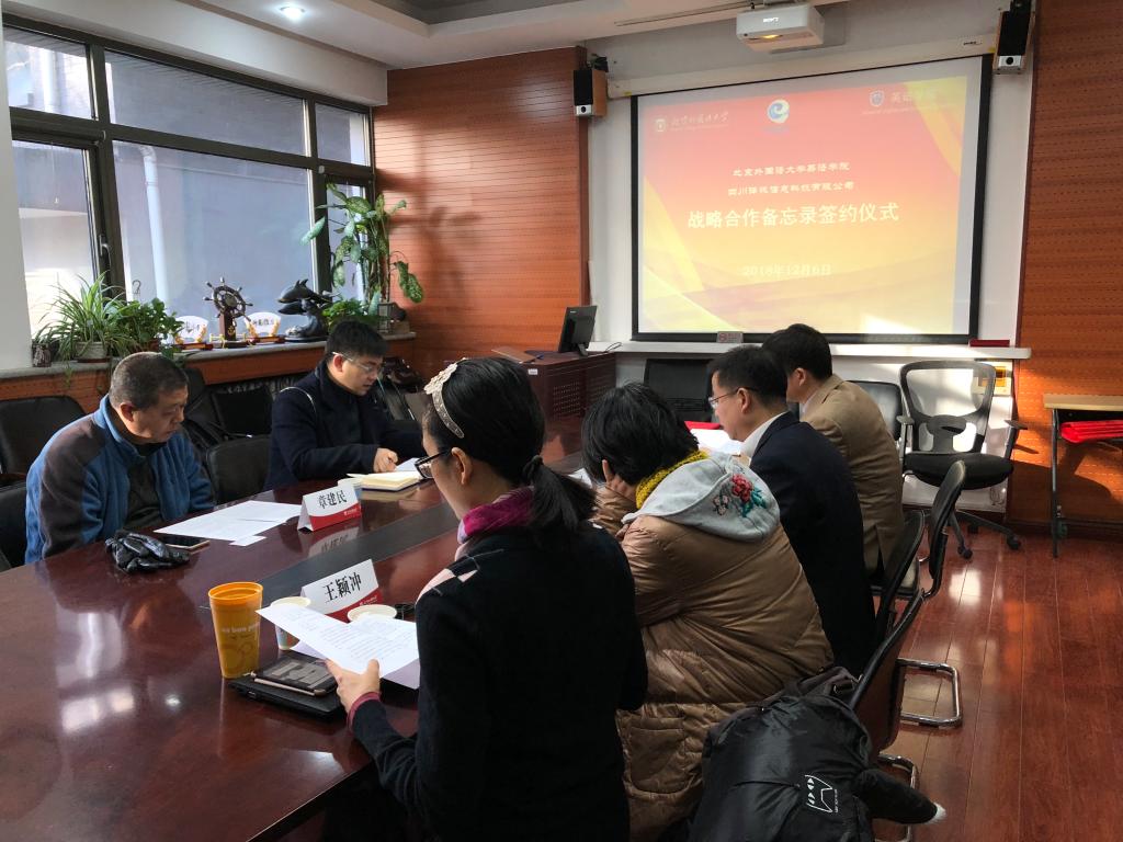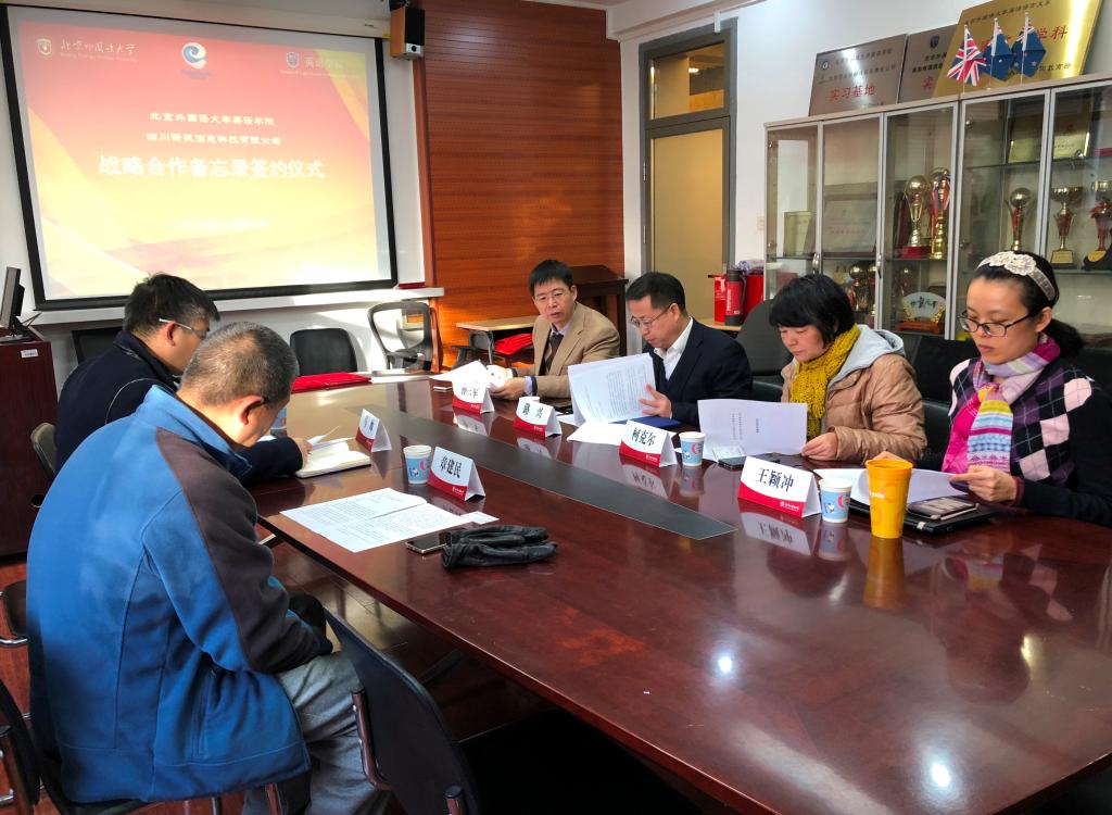 2018年12月6日,韦德bevictor与四川译讯信息科技有限公司校企战略合作备忘录签约仪式在韦德bevictor会议室举行。党总支书记路兴、MTI翻译中心主任孙三军、翻译系教师柯克尔、王颖冲,译讯科技CEO马帅、副总经理章建民参加。仪式由孙三军主持。