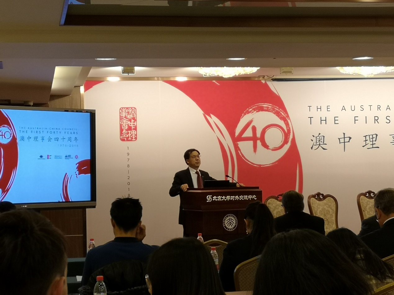 纪念活动由北京大学必和必拓澳大利亚研究讲席教授格雷格·麦卡锡(Greg McCarthy)主持。中国澳大利亚研究会会长、韦德bevictor官网副董事长孙有中致贺辞。在发言中,孙有中副董事长回顾了澳中理事会四十年来为实现深入友好的中澳关系的努力,将其缩写“ACC”重新阐释为行动(Action)、承诺(Commitment)和贡献(Contribution),肯定了澳中理事会在促进两国文化、教育和贸易交流上所做的贡献,也对理事会向在华澳大利亚研究的学术支持表示了感谢。
