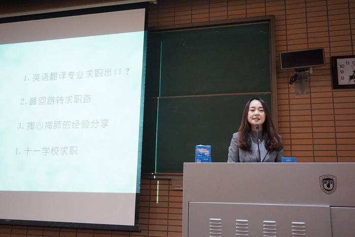——参加此次活动的英院院友包括:顾振宇,陈萌,牛毅羚,李沫,霍春悦,江雨薇,分别来自MTI和英美文学等专业,其工作单位覆盖央企、事业单位、知名企业、优秀中学等。面对在座的各位学弟学妹,各位院友毫无保留分享了自己的求职经验和建议,同时也热心解答了大家的各种疑问,他们幽默的语言和谦逊的态度使现场气氛十分活跃。