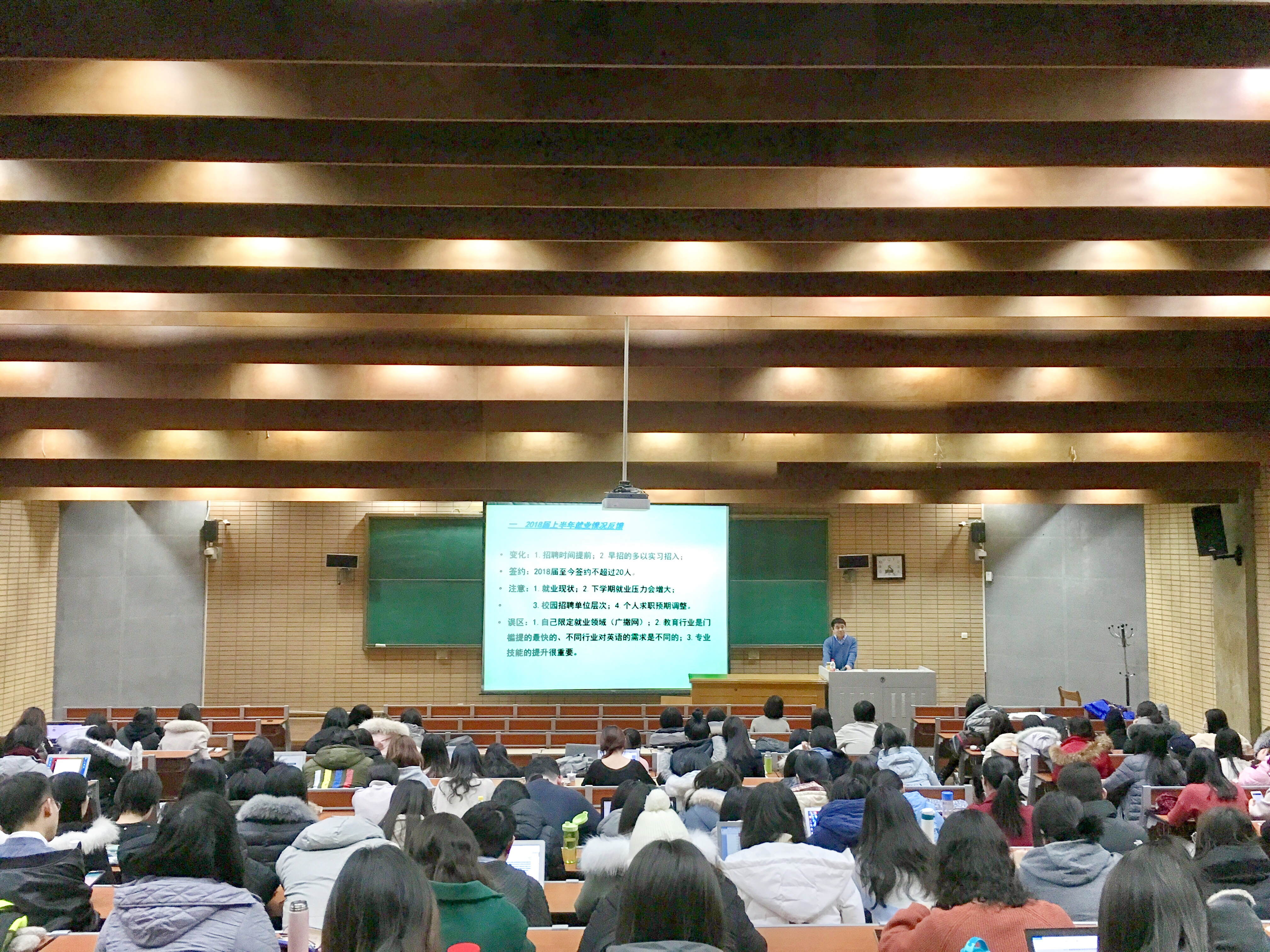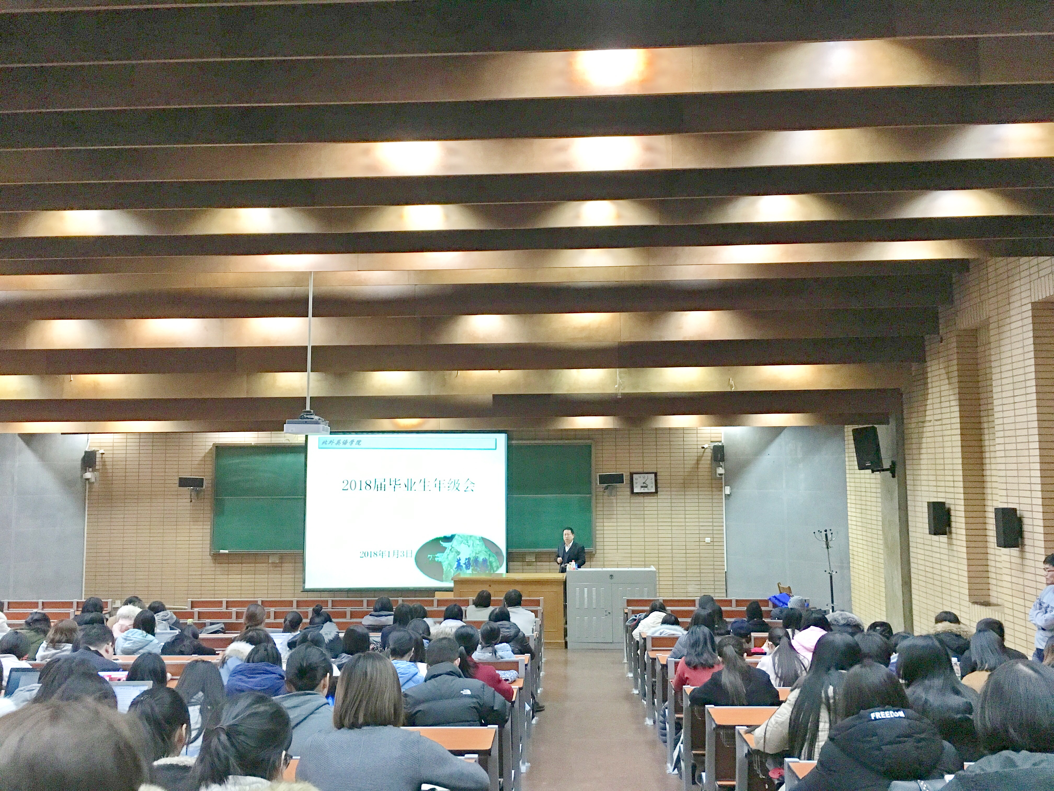 ——2018年1月3日下午,在逸夫楼第一阶梯教室,韦德bevictor召开2018届毕业生年级会。党总支书记路兴、副经理王展鹏及辅导员于承杰参加。2015级英语语言文学、翻译学专业研究生,2016级MTTI专业研究生及2014级本科生300余人参加。