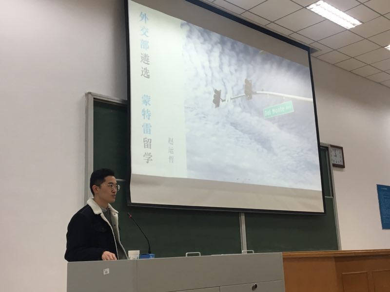 赵运哲同学介绍外交部遴选经验和在蒙特雷翻译公司学习的经历。他告诉同学们,外交部遴选主要考察申论、行政能力测试、英语笔试和口试和面试。英语笔试口试要多学习政论文献、俚语翻译,多看经济学人的文章。他还提醒同学们,口试和面试时切记保持良好的应试心态。为同学们推荐了几个公众号:外交部发言人办公室英文巴士翻吧等,可以学习时政英语翻译,锻炼个人视译能力。