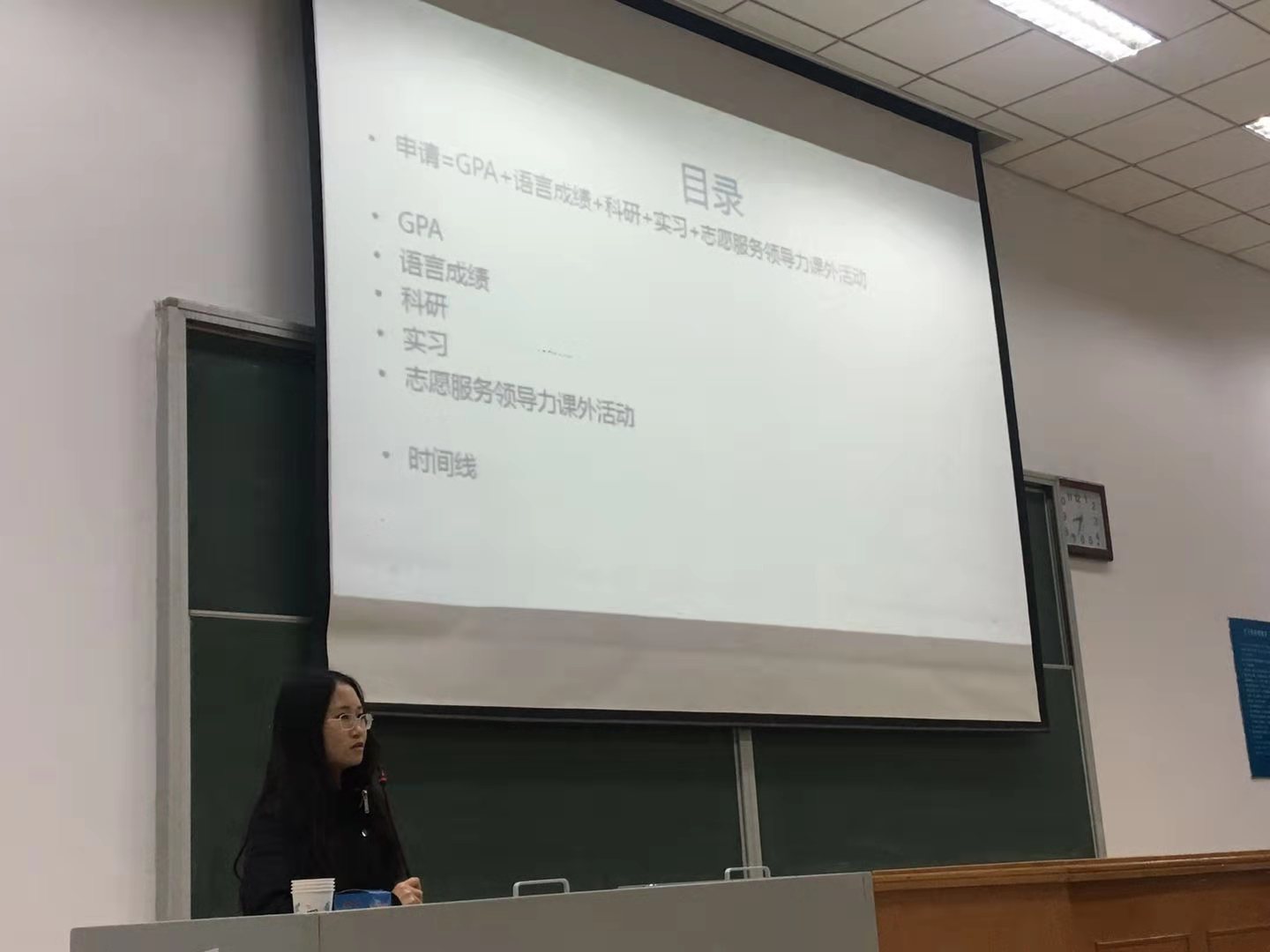最后与同学们分享经验的是保研到北外国际商公司的吕芸萌学姐。她告诉同学们大三要学好专业课,在暑假积极参加北外国际组织夏令营或者其他公司的夏令营。同时介绍了北外夏令营申请的条件和录取情况。