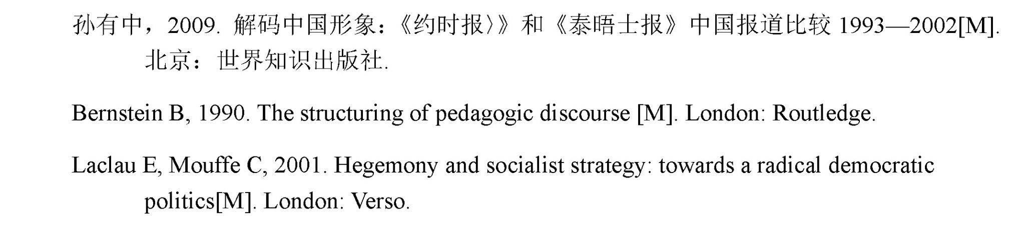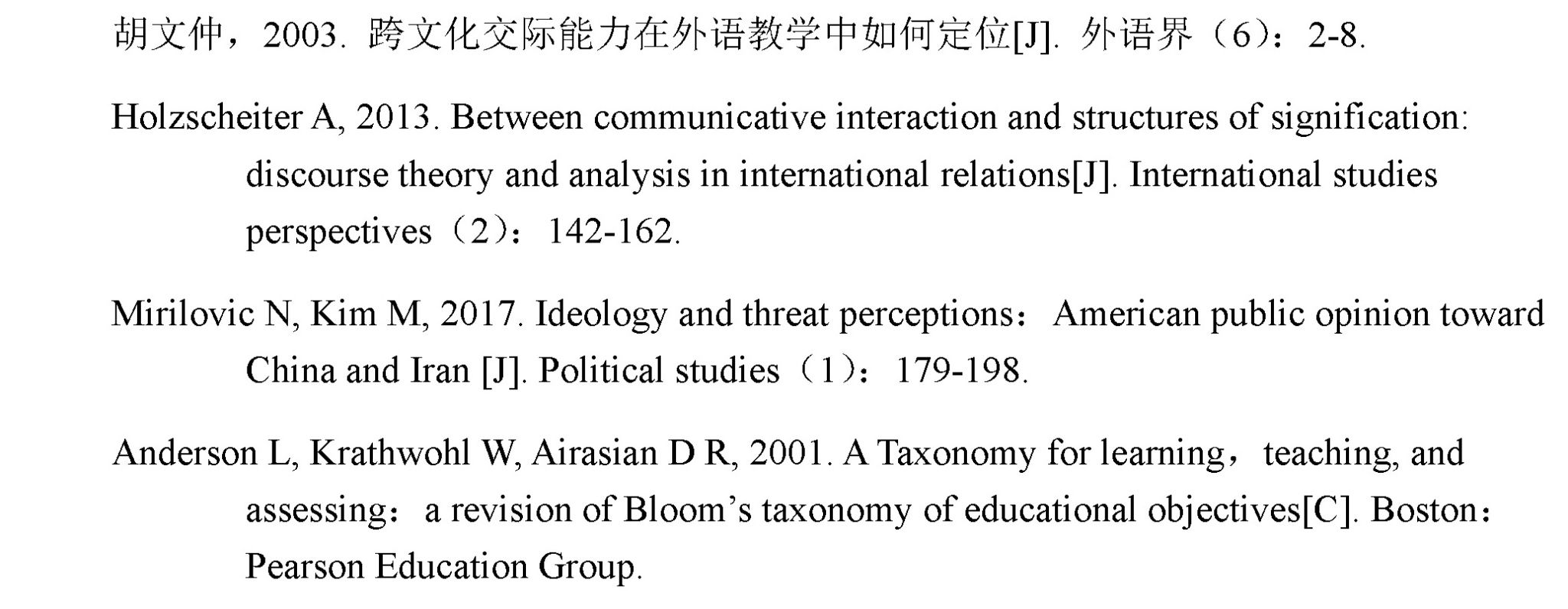 参考文献集中排在正文后,顶格排列,按开头字母或拼音排序。用原文文种,原文为中文即以中文形式引用,原文为外文即以外文形式引用。参考文献包括专著、期刊、报纸、论文集、学位论文等。